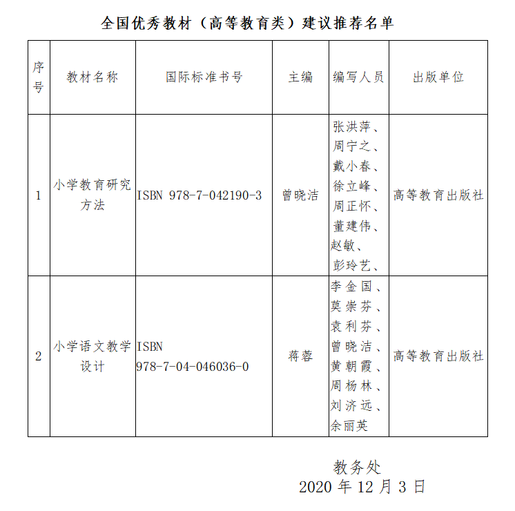根据省委宣传部、省委教育工委、省教育厅联合发布的《关于开展首届全国教材建设奖推荐工作的通知》(湘教通[2020]279号)要求,我校下发通知,组织院部申报,截止2020年12月3日,共有2种教材申报2020年全国教材建设奖全国优秀教材(高等教育类)。现将建议推荐优秀教材名单予以公示。公示期12月4日至12月8日。公示期内,若有异议,请以书面形式向教务处反映,也可直接向学校监察处反映,联系电话:0731-88227529(教务处),0731-88227198(监察处)。