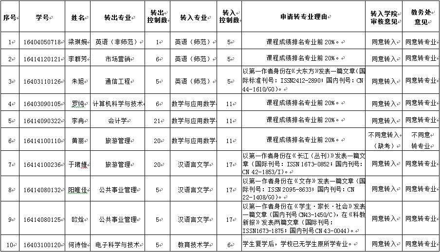 根据《湖南第一师范学院普通全日制本科学生转专业管理办法》(湘一师校字〔2017〕66号)文件精神,经学生本人申请,学院审核,教务处复审,并报主管校领导审核,现将2017年秋季学期学生转专业情况进行公示。