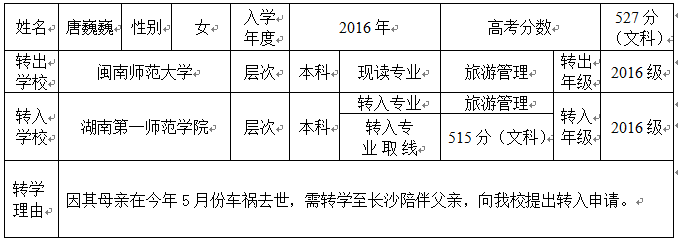 根据《普通高等学校学生管理规定》(教育部令第21号)、《教育部办公厅关于进一步规范普通高等学校转学工作的通知》(教学厅〔2015〕4号)、湖南省教育厅《转发教育部办公厅关于进一步规范普通高等学校转学工作的通知》(湘教通〔2015〕294号)和《湖南第一师范学院普通全日制本科学生转学管理办法(试行)》等文件规定,经学生本人申请,学院初审,教务处复审,并报学校领导集体研究,现将拟同意转学的学生有关情况进行公示。